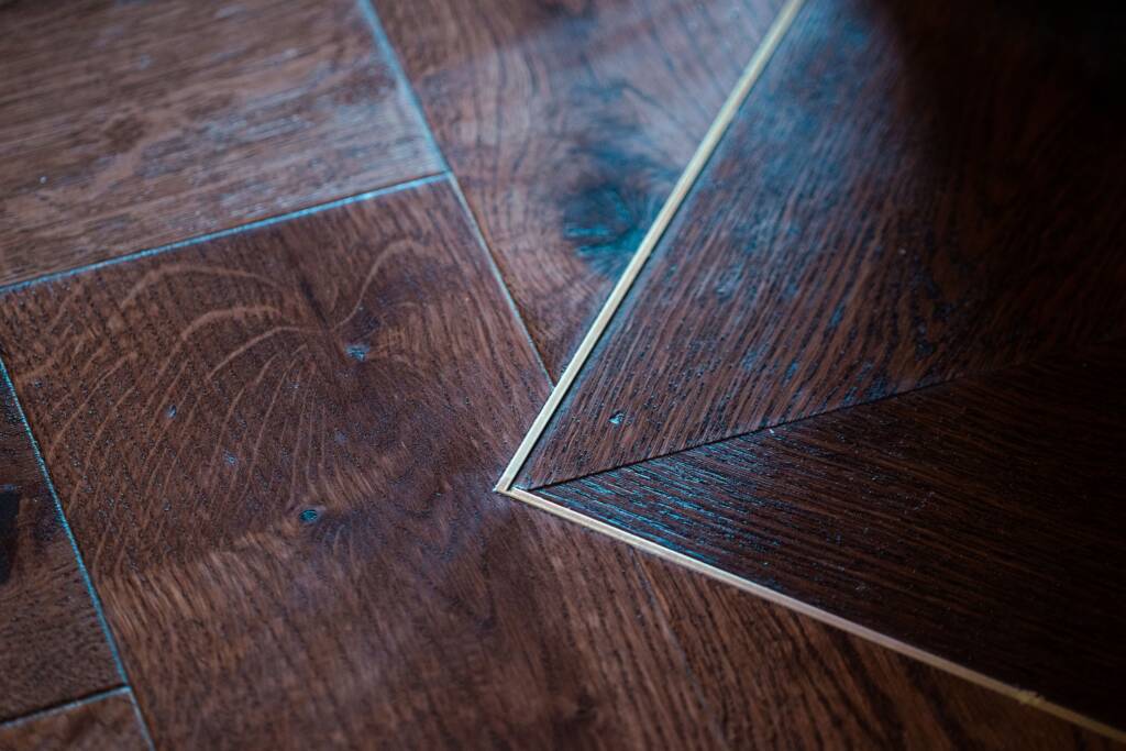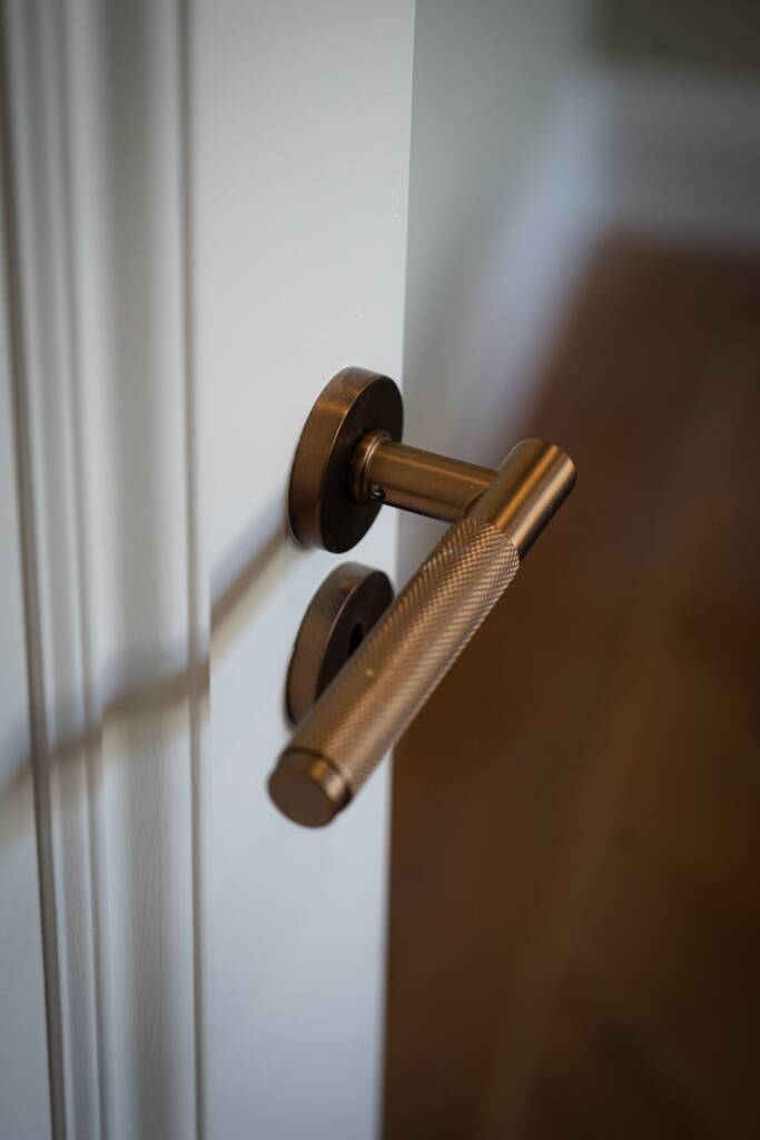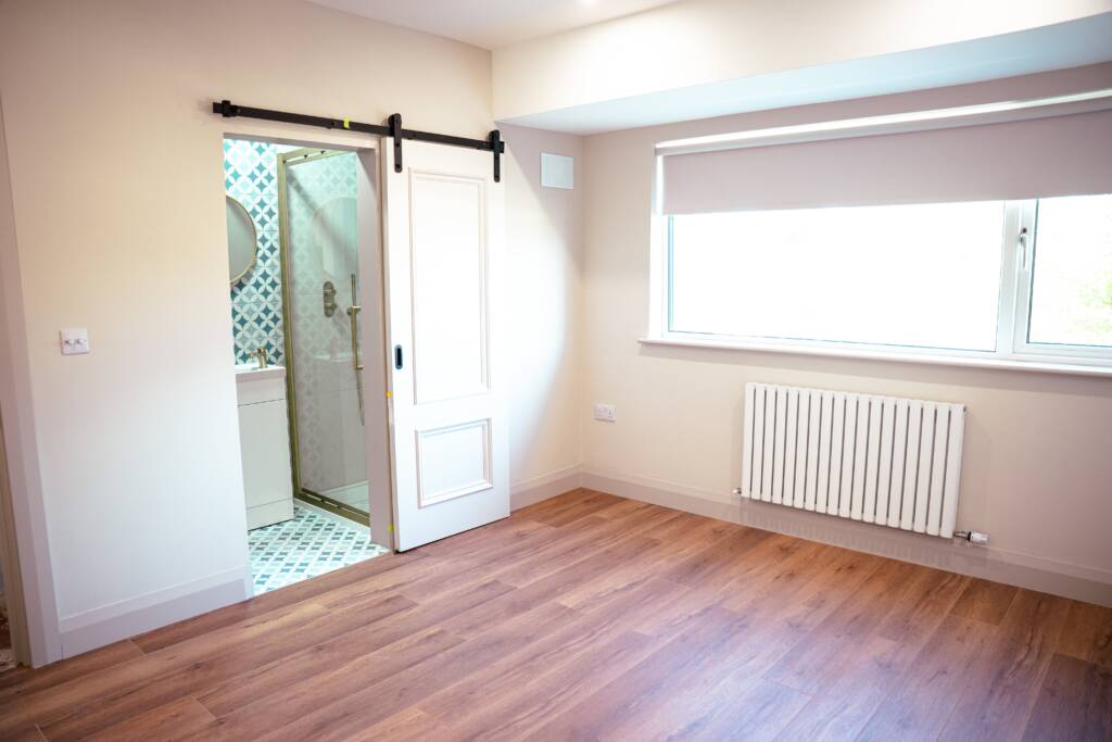 Inside, every room was renewed. We installed underfloor heating throughout the house powered by an air-to-water system with PV adaptation available, and pumped 300 mm of TLA insulation into the floors for excellent thermal performance. All internal walls were reslabbed, dry-lined and reskimmed to achieve improved airtightness. We fitted new floors and doors throughout with full second-fix carpentry, including semi-solid herringbone flooring with a brass border for a bespoke finish.