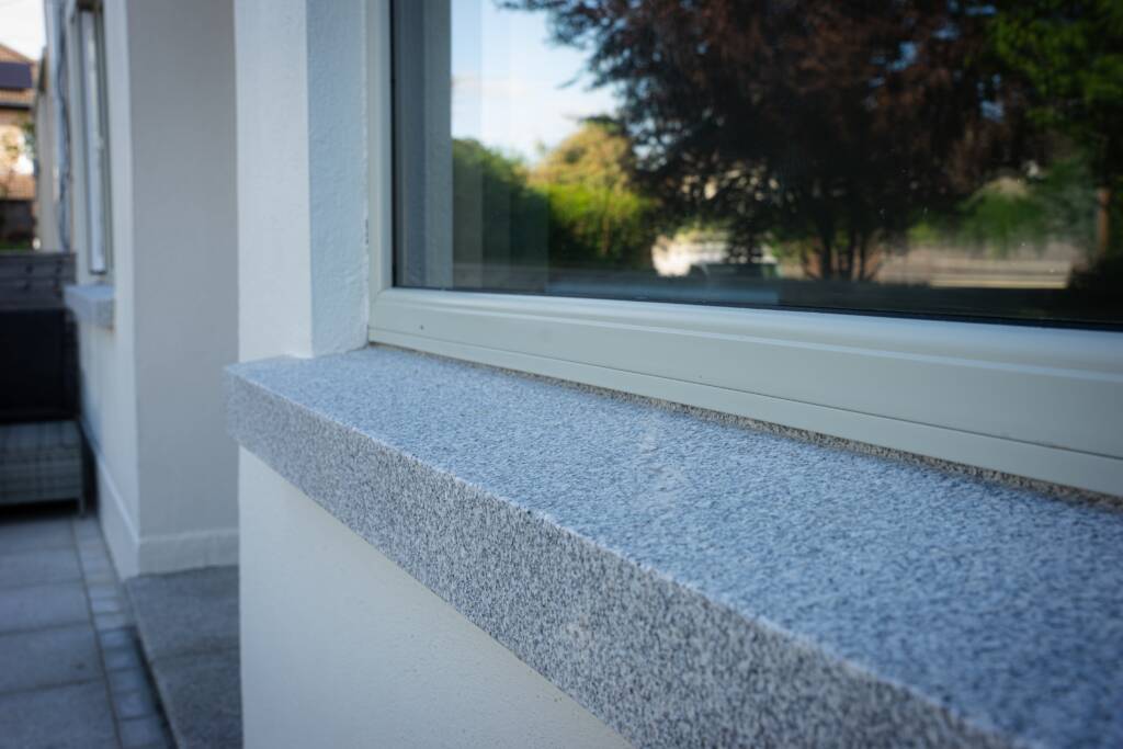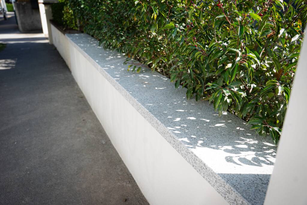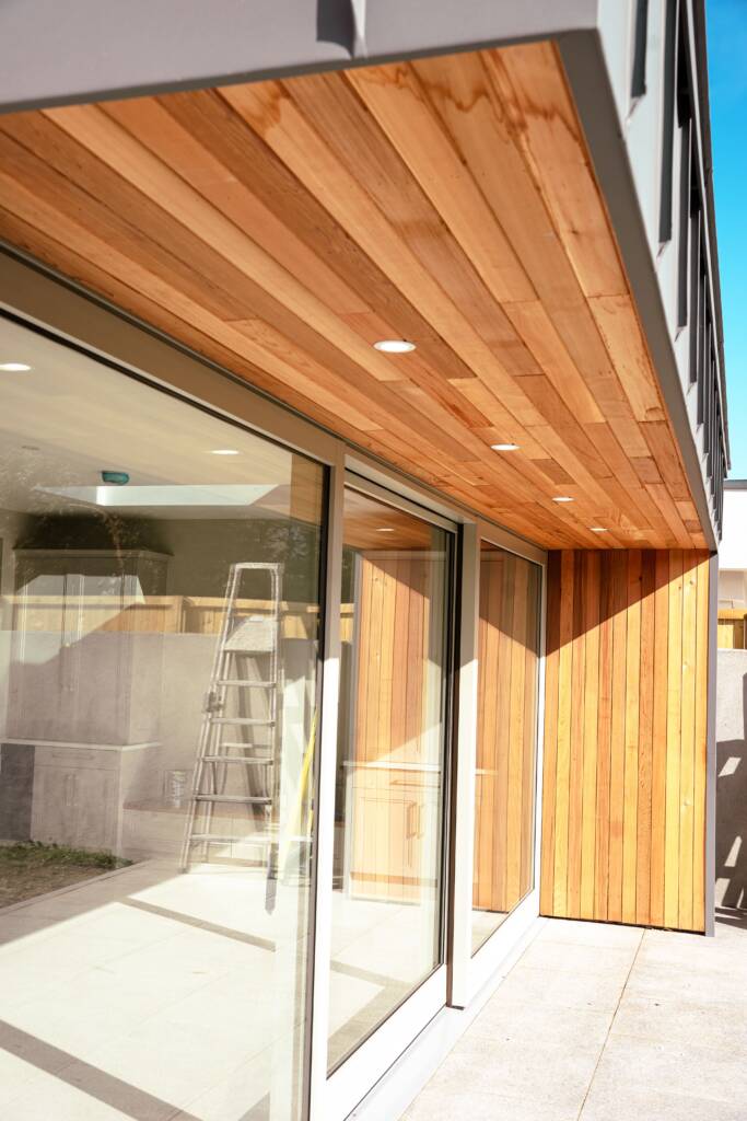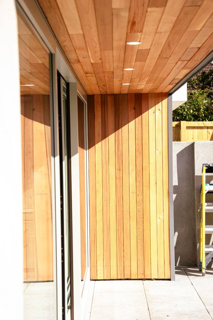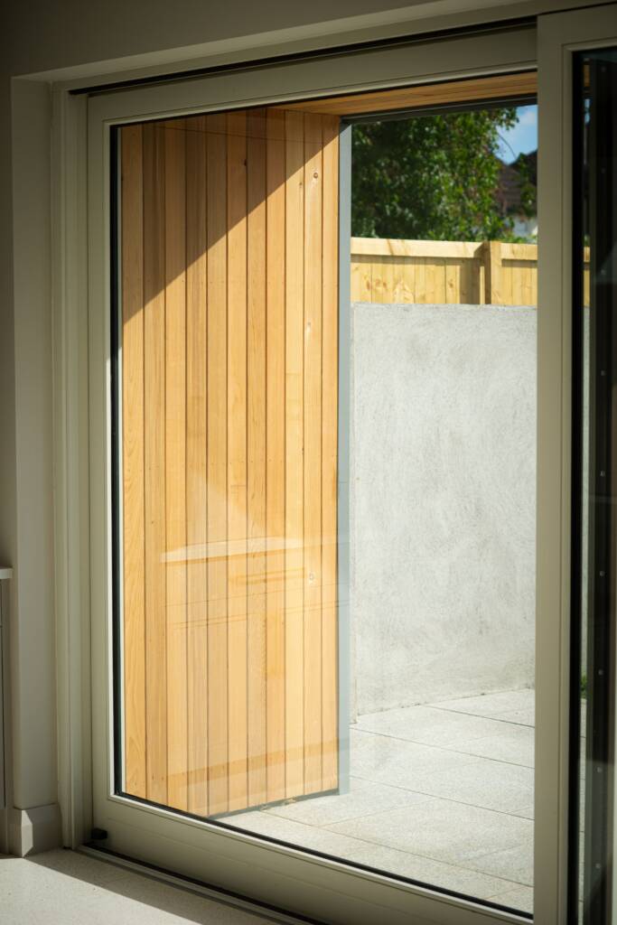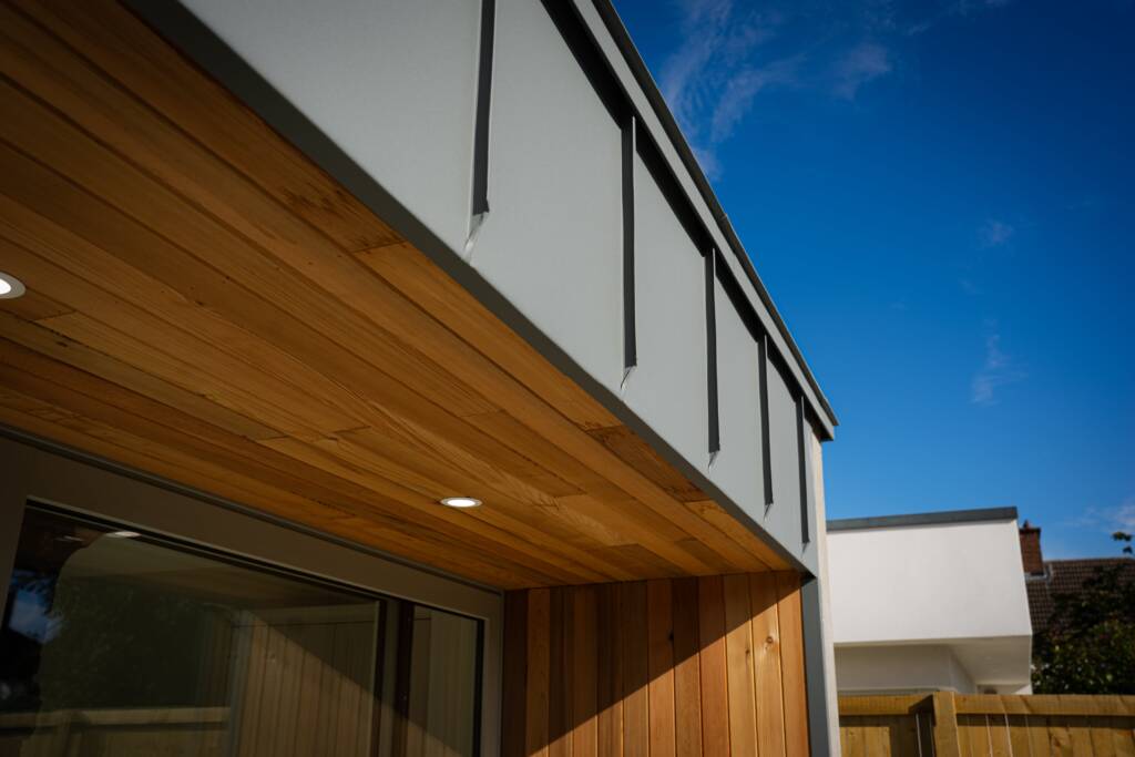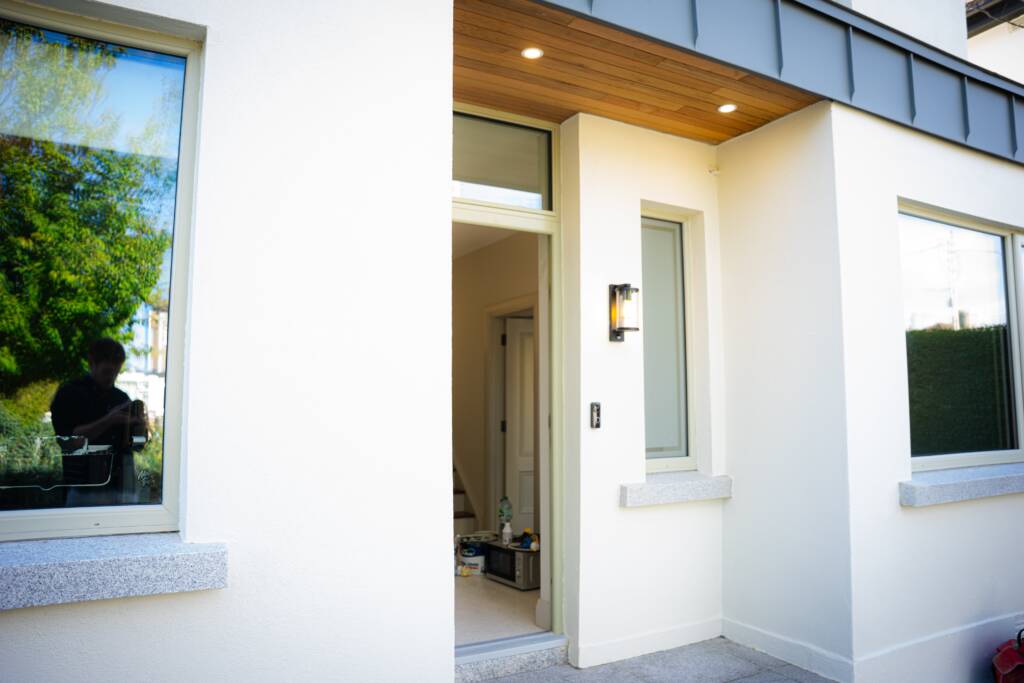 Outside, we gave the property a striking new look. At the front, a new wall with granite capping and fresh plasterwork sets the tone. We installed a flat fibreglass roof with a zinc parapet, complemented by tongue-and-groove cedarwood cladding and matching soffits and gutters. At the rear, the extension mirrors this contemporary detailing with its own zinc parapet and cedarwood soffit, and we laid granite paving to extend the living space into the garden. Side walls were replastered and painted for a crisp finish, and an EV charger was added to the front of the house to future-proof it.